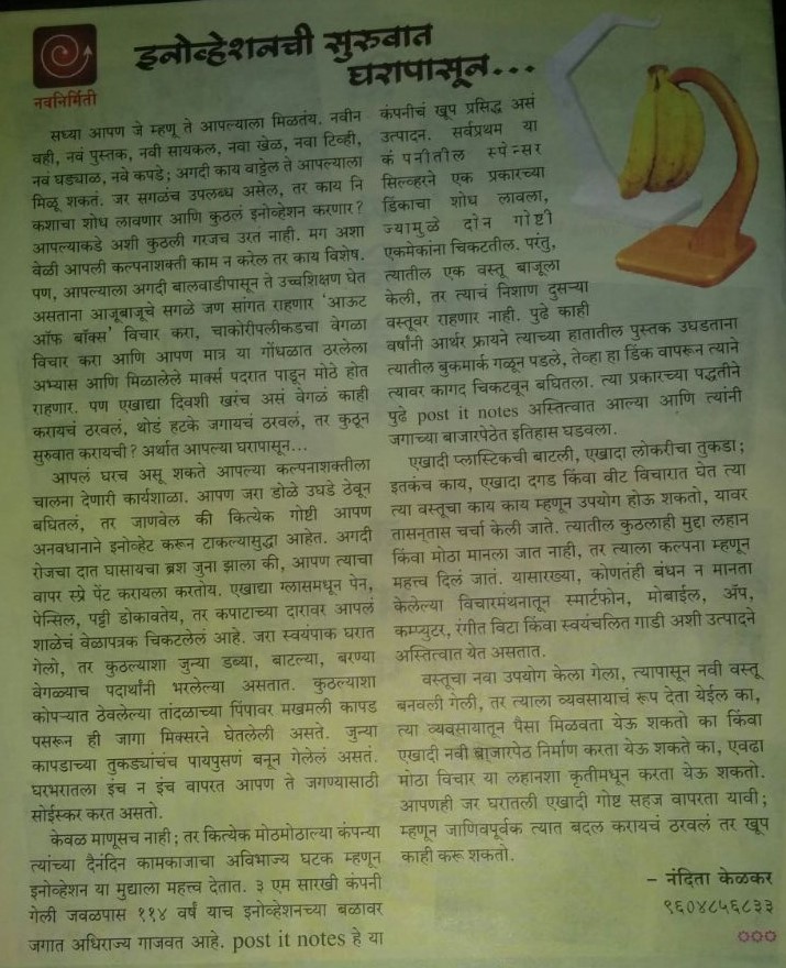 सध्या आपण जे म्हणू ते आपल्याला मिळतंय. नवीन वही, नवं पुस्तक, नवी सायकल, नवा खेळ, नवा टीव्ही, नवं घड्याळ, नवे कपडे अगदी काय वाट्टेल ते आपल्याला मिळू शकतं. जर सगळंच उपलब्ध असेल तर काय नि कशाचा शोध लावणार आणि कुठलं इनोव्हेशन करणार? आपल्याकडे अशी कुठली गरजच उरत नाही जी भागत नाही मग अशा वेळी आपली कल्पनाशक्ती काम न करेल तर काय विशेष. पण आपल्याला अगदी बालवाडीपासून ते पार उच्चशिक्षण घेत असताना आजूबाजूने सगळेजण सांगत राहणार आउट ऑफ बॉक्स विचार करा, चाकोरीपलिकडचा वेगळा विचार करा आणि आपण मात्र या गोंधळात ठरलेला अभ्यास आणि मिळालेले मार्क पदरात पाडून मोठे होत राहणार. पण एखाद्या दिवशी खरंच असं वेगळं काही करायचं ठरवलं तर थोडं हटके जगायचं ठरवलं तर कुठून सुरुवात करायची?… अर्थात आपल्या घरापासून.