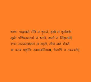 कावळा कमळाच्या आनंद उपभोगत नाही, हंस डबक्यातील पाण्यात डुंबत नाही, मूर्खांना विद्वानांच्या सानिध्यात रमावेसे वाटत नाही, नोकरांना सिंहासनावर बसावेसे वाटत नाही, दुष्टांना सज्जनांसह रहावेसे वाटत नाही तर शूद्रांची सेवा करावीशी वाटते. ज्याचं जो मूळ स्वभाव असतो, तो त्याच्यापासून कधीही दूर राहू शकत नाही.