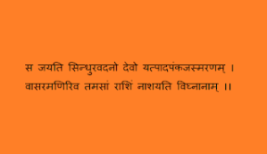 शेंदुराने ज्याचे मुख शोभून दिसते अशा श्री गणेशाचा जयजयकार असो. सूर्य जसा अंधाराचा तसे तसे गणेशाच्या चरणकमलाचे दर्शन सर्व विघ्नांपासून मुक्ती देते.