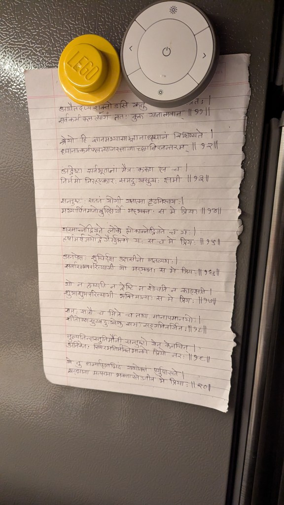 I remember the days when my grandmother used to make us learn geeta adhyayaa, hundreds of poems and even good passages mentioned in just any book. We did it then. Later, those paragraphs and poems helped us present good diction. They provided an understanding of our language, which can only be passed from elder generations to the new ones. Even today, my grandmother-in-law told me about the times when our elders knew all 18 adhyayas of Geeta. She suggested that we should also try to remember one adhyaya every year. Yes, people will say, no need to be bothered or why to pay attention to such things…they keep saying such things…they always have lots of expectations…true. but I thought this was a very small suggestion… That to it was supposed to be for my own good. If should be able to spare at least a bit of time for. Myself to learn something new or just do something without any expectations.